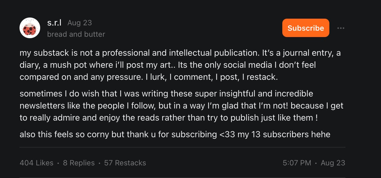 The above analysis, at least, holds veracity— and the essay itself? Brilliantly written. Thoroughly enjoyed. I am also very willing to say that Sundberg had…valid critiques of the quality of writing spurred on by a social media algorithm, despite how much this ruffled from feathers. The shape of Substack encourages users to write along algorithmic-backed trends in pursuit of social media metrics of success— likes and views that convert to visibility, and visibility which (hopefully) converts to paid subscribers. Algorithmic success, unfortunately or fortunately, encourages sameness. Later in the essay, Sundberg cites a collaborator she pitched the above essay to. She quotes his email response to her: “Monetized diary entries is totally right. I cringe when I hit a paywall on some random weekend update newsletter of a writer who I subscribed to because their work was interesting. Like you want me to pay for 5 links you read this week or your fav new novel?”