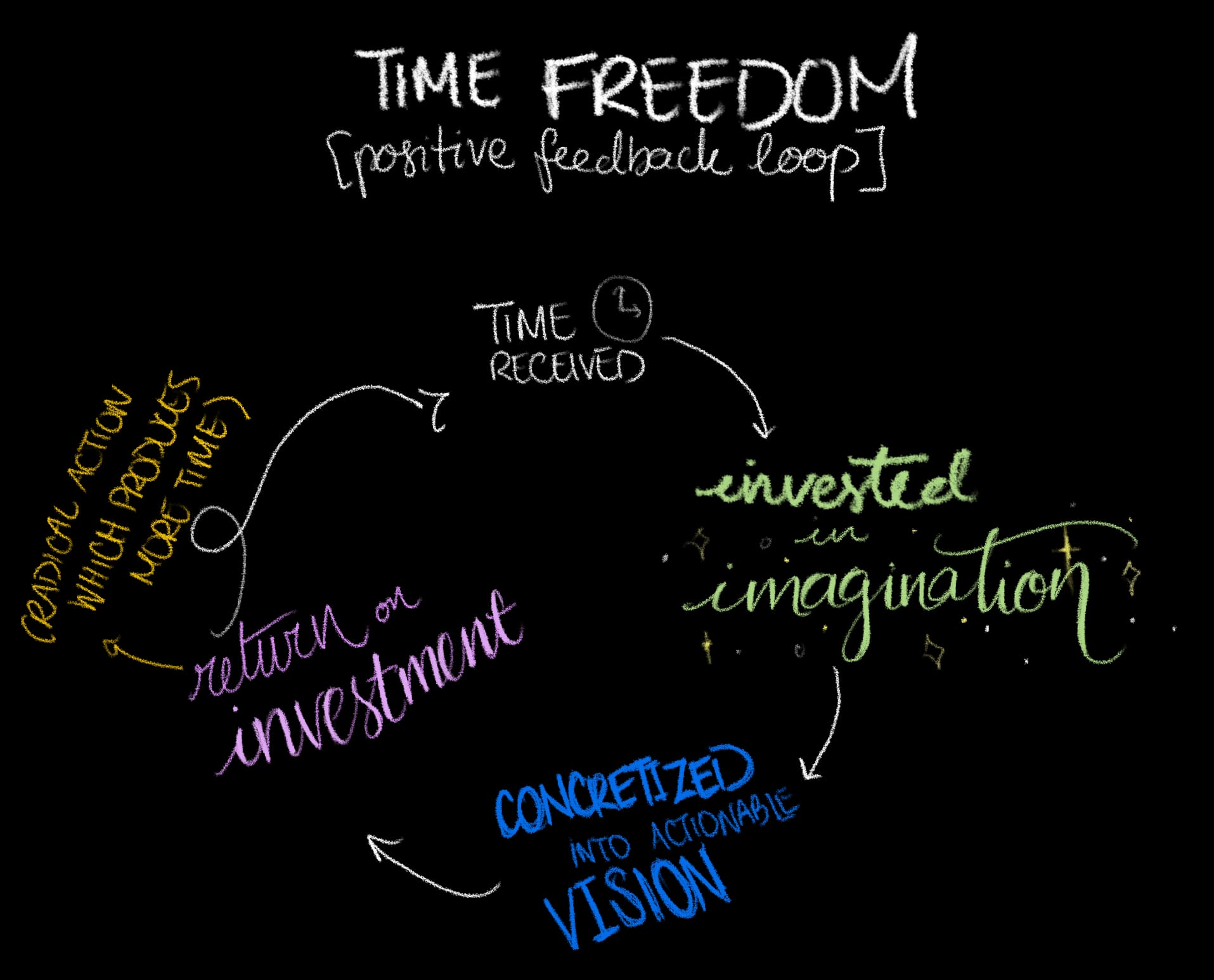 Time freedom, time sovereignty, goes beyond spending it on loved ones or pleasures. In terms of first priority, I am in need of time to pray. Do you see the feedback loop? I get time; I gift it to my imagination. Me and my mind and my Benevolent Divine, we sit in contemplative prayer and focused acquisition of our greater desires. The focus yields a concretized vision, which in return brings us to actions which create more time. The feedback loop goes around like this. I act and so then it is and so I act like it is and so that it is— except for the return on this investment is not necessarily money (although it could be). It's time. It's that I get more time. That I get more time to spread. I believe that this works and because I believe it works I move like it does, and time falls into my hands, and then I gift it to my imaginings and my imagination leads me to new actions which produce more time. Repeat. Repeat. I love this song.