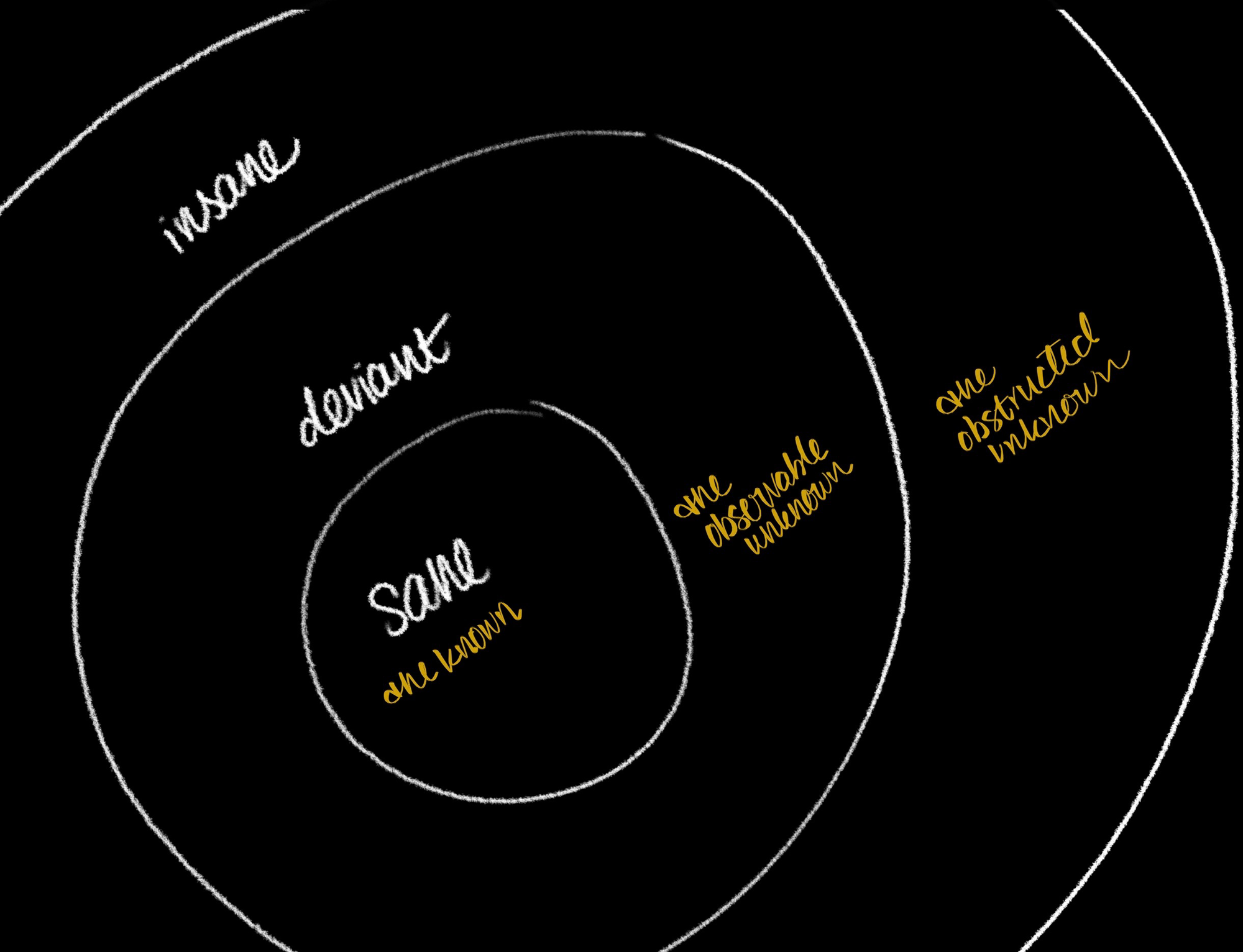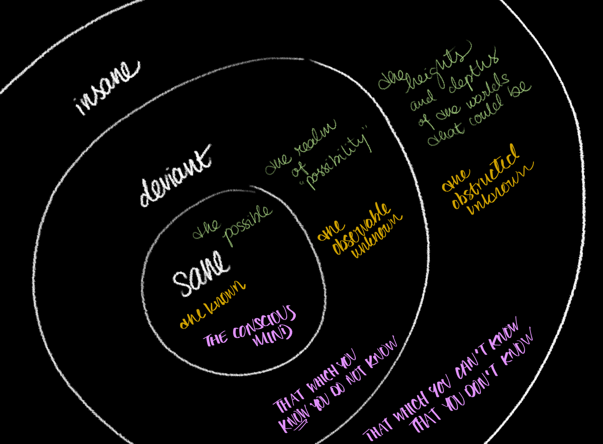 The borders of the mind are the knowable and the safe (thus, the sane) and the unknowable, unsafe, uncharted deviance from compliance (insane).