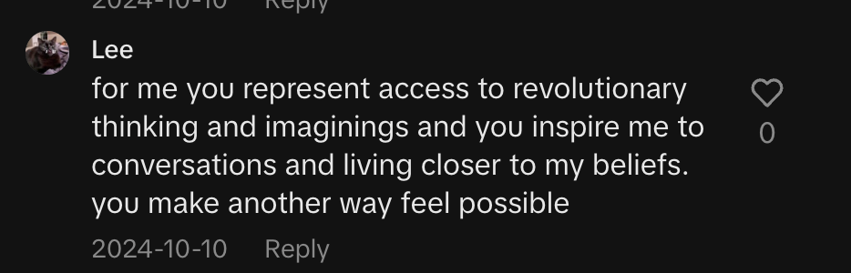Then, to the rest of us in my living room here with me: when we think of revolution, we think of militants with guns. We do not think of newspapers and budget meetings and town halls and food prep and hospital transit and admin all the in-between technologies of building out new infrastructure. Revolution is the start of something, not just an ending to old systems. It’s a marriage. It’s a baby being born. It’s fragile and needs to be protected. And: revolution seizes power from the state. Oftentimes, we imagine the seizure of state power by force; that’s true, and necessary, and not exclusive. Power, in any reality, comes from how many people believe in your reality enough to participate in it. Remember that reality is just what we collectively witness. If you build educational systems or food systems or healthcare or architecture or infrastructural support that makes masses of folks invest more in your system than they invest in the state, you have successfully made yourself an enemy of the state.
